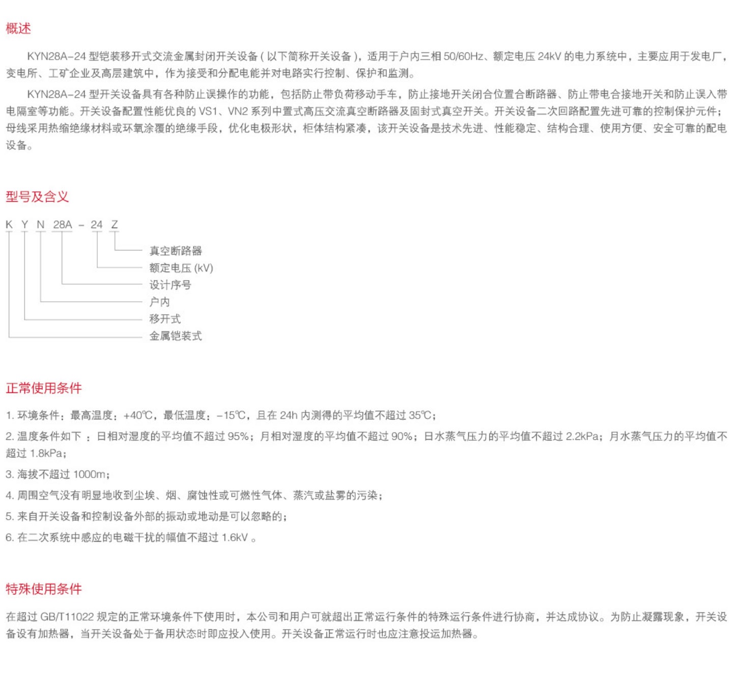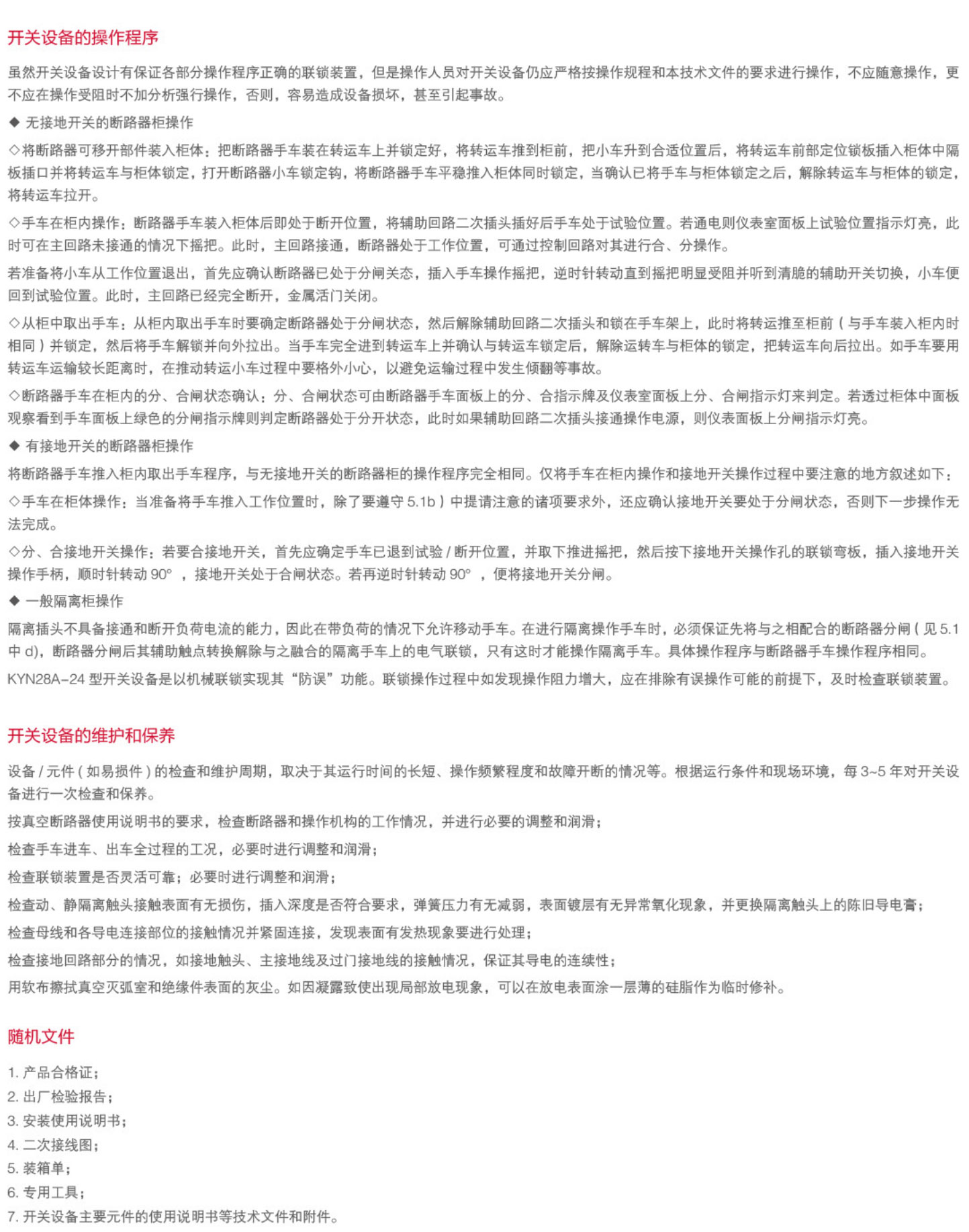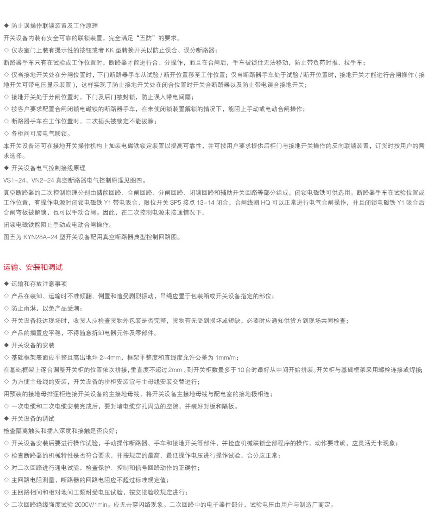KYN28A-24型铠装移开式交流金属封闭开关设备(以下简称开关设备),适用于户内三相50/60Hz、额定电压24kV的电力系统中,主要应用于发电厂,变电所、工矿企业及高层建筑中,作为接受和分配电能并对电路实行控制、保护和监测。KYN28A-24型开关设备具有各种防止误操作的功能,包括防止带负荷移动手车,防止接地开关闭合位置合断路器、防止带电合接地开关和防止误入带电隔室等功能。开关设备配置性能优良的VS1、VN2系列中置式高压交流真空断路器及固封式真空开关。开关设备二次回路配置先进可靠的控制保护元件;母线采用热缩绝缘材料或环氧涂覆的绝缘手段,优化电极形状,柜体结构紧凑,该开关设备是技术先进、性能稳定、结构合理、使用方便、安全可靠的配电设备...